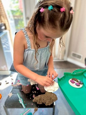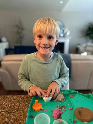 [This review was collected as part of a promotion.] We love kinetic sand. I love it because its easy to clean up and it provides hours of fun for my six year old. The carry case is genius. I especially love that he enjoys making me coffees and frappes He loves creating different coffees for me. Makes him feel pretty proud of himself. As a bonus, its something we can play together.