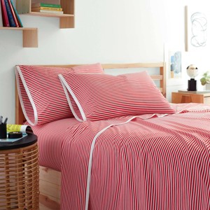 The Martex Clean AF Pinstripe Sheet Set with SILVERbac™ Antimicrobial Technology contains lab-tested, silver-infused fibers to inhibit the growth of odor-causing bacteria. This permanent feature won’t wash or wear away, so you’ll sleep clean on sheets that stay fresher longer. With its cheeky name, the casual Clean AF collection is perfect for the dorm room. The Martex Clean AF Pinstripe Sheet Set features super-soft, cotton-rich fabrications for extraordinary comfort and ease of care. It’s available in three classic colors: Gray Stripe, Blue Stripe, and Red Stripe, which appears on both sides of the matching pillowcases. The sets come in self-fabric bags and the Twin and Twin XL sets each come with one pillowcase. For more than 50 years, heritage brand Martex has represented loving families and the brand creates items for discerning consumers who demand high-quality products with style. Martex delivers every aspect of today's happy home, through moments of love, wellness, and inspiration. Features SILVERbac™ Antimicrobial Technology powered by silver-infused fibers to inhibit the growth of odor-causing bacteria — permanent protection that won’t wash or wear away Stays fresher longer Lab tested for peace of mind Cotton-rich for a super-soft feel Available in Three Colors: Gray Stripe, Blue Stripe and Red Stripe Twin size dimensions: Flat sheet: 66"W x 96"L; Fitted sheet: 39"W x 75"L x 13"D; Standard pillowcase: 20"W x 30"L Twin XL size dimensions: Flat sheet: 66"W x 101"L; Fitted sheet: 39"W x 80"L x 13"D; Standard pillowcase: 20"W x 30"L Full size dimensions: Flat sheet: 81"W x 96"L; Fitted sheet: 54"W x 75"L x 13"D; Standard pillowcases: 20"W x 30"L Queen size dimensions: Flat sheet: 90"W x 102"L; Fitted sheet: 60"W x 80"L x 13"D; Standard pillowcases: 20"W x 30"L King size dimensions: Flat sheet: 108"W x 102"L; Fitted sheet: 78"W x 80"L x 13"D; King size pillowcases: 20"W x 40"L Fitted sheets, which feature all-around elastic for a snug fit, accommodate mattresses up to 15” deep Made of a 67% Cotton/26% Polyester/ 7% Silver-infused Polyester Machine washable and dryer safe