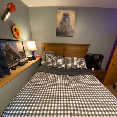 We love this. The color is a great grey blue color and the plaid side is nice and soft. I ordered this on sale so it was a great price. It’s also a nice size for being full/queen.