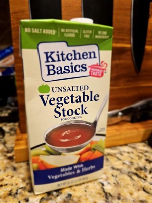 Elevate your cooking with Kitchen Basics Original Chicken Stock, 32 oz. The perfect foundation for all of your homemade dishes, this high-quality stock is made with classic, full-bodied flavors of chicken, tender veggies, and a blend of herbs and spices. Slow-simmered for hours, our chicken stock is bursting with authentic flavors that will bring your recipes to life. What sets us apart is our commitment to using delicious ingredients and no artificial flavors or added MSG. Plus, with 45% less sodium than the leading regular chicken broth brand*, you can enjoy all the flavor without the guilt. Whether you're making a comforting chicken noodle soup, hearty white chicken chili or a flavorful casserole, a splash of our versatile chicken stock will take your dishes to the next level. And with its convenient carton packaging, it's easy to stock up in your pantry for all your cooking needs. Try it today and taste the difference Kitchen Basics can make in your homemade meals!