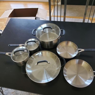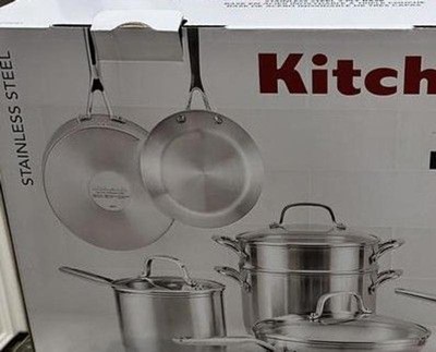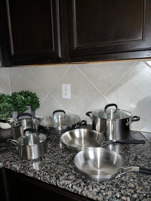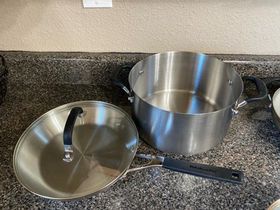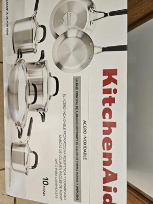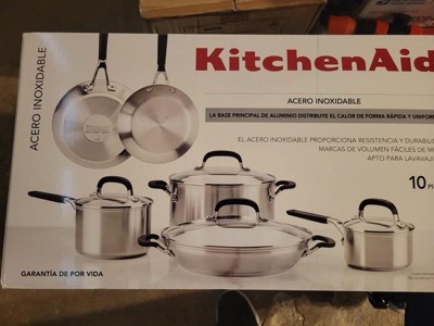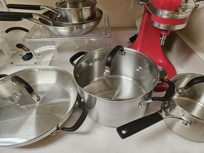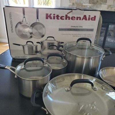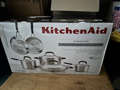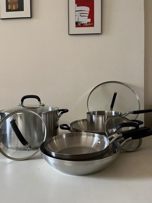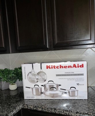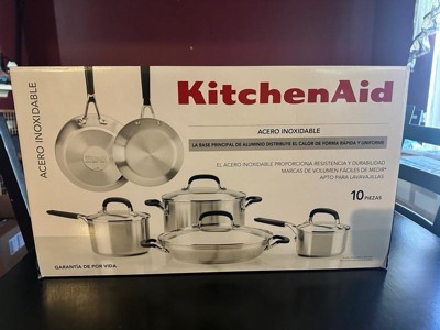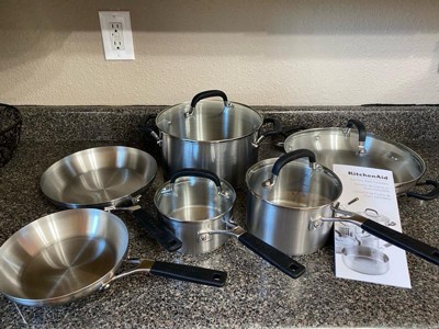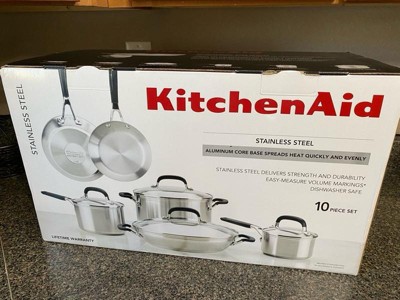 KitchenAid 10pc Stainless Steel Cookware Set Light Silver: Induction & Oven Safe, Dishwasher Safe, Tempered Glass Lids