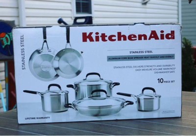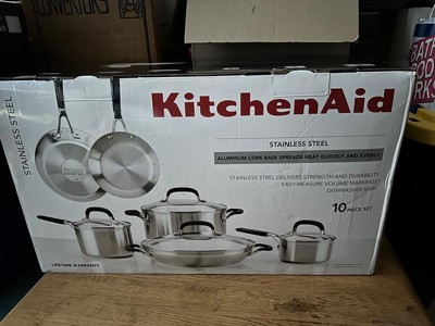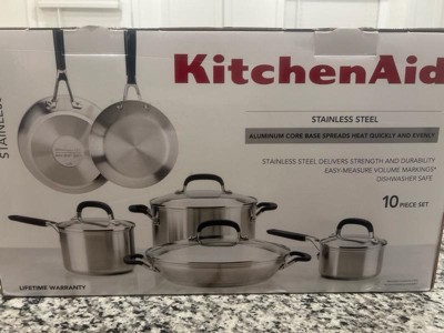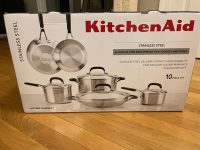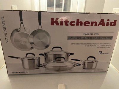Ignite kitchen creativity and experience rich flavor with the KitchenAid Stainless Steel 10-Piece Cookware Set. Crafted from durable stainless steel with a layer of heat-conductive aluminum in the base, these pots and pans are designed to heat quickly and evenly to grill, boil, and simmer with ease. Saucepans and stockpot feature etched measuring marks to add measured ingredients. Stainless steel handles have been finished with silicone grips for a cooler handle while cooking, when compared to traditional stainless steel handles, while tempered glass lids seal in heat and flavor. Pots and pans are dishwasher safe for quick, easy cleanup and oven safe to 400°F (350°F with lids) for making a wide range of delicious recipes.