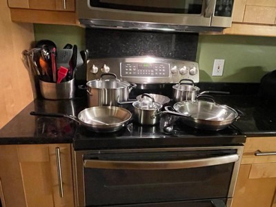 [This review was collected as part of a promotion.] This stainless steel cookware set has everything you need to set up your kitchen. Imagine my excitement because I was desperately in need of new pots and pans. You definitely have to be careful with cleaning or handling these pots and pans. Food sticks, surfaces burn, and more often than not, clean up can be a headache.