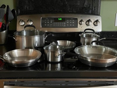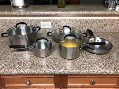 - QUICK, EVEN HEATING: Pots and pans have been crafted from stainless steel with an aluminum core base to spread heat quickly and evenly