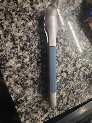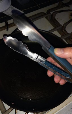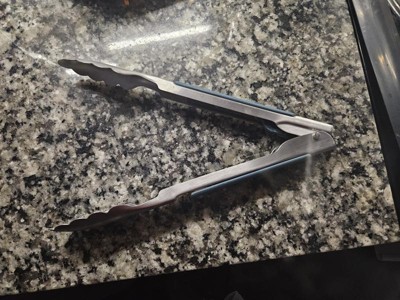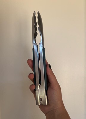 These 9" tongs from KitchenAid are sturdy enough for bigger steaks and even 3 to 4 pound roasts. The edges of the tongs are metal scallops so it can cleanly grab even marinated or seasoned roasts. This model has blue plastic grips on the side and the open/close mechanism is on the side. The entire blue grip slides back and forth to open and securely close for storage. The method to lock these tongs takes some getting used to but once learned it becomes second nature. The good thing is that these can be unlocked with one hand so it soon becomes second nature. Very sturdy and precise in use.