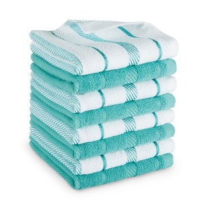 - SET OF EIGHT DISHCLOTHS: Includes four (4) striped dishcloths in aqua and white and four (4) solid aqua dishcloth. Each generously sized towel measures 12" W x 12" L.
