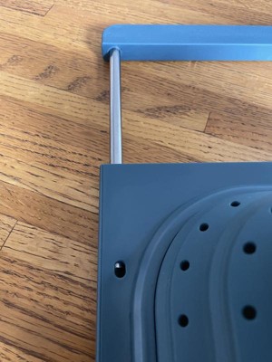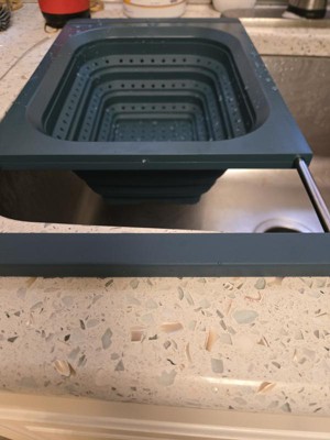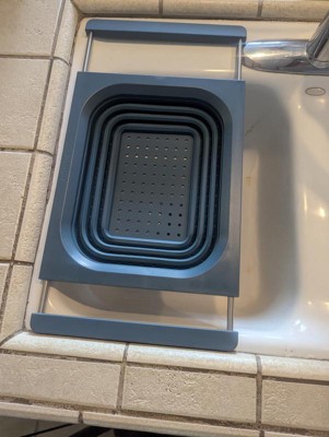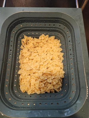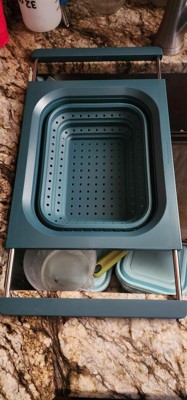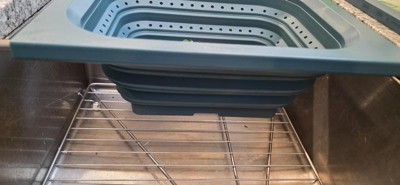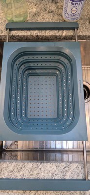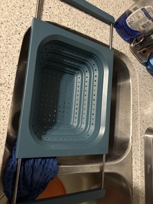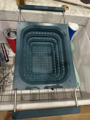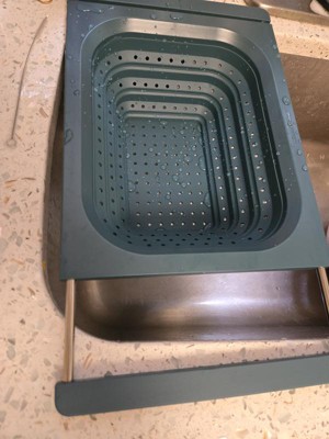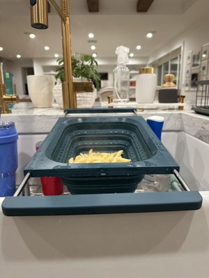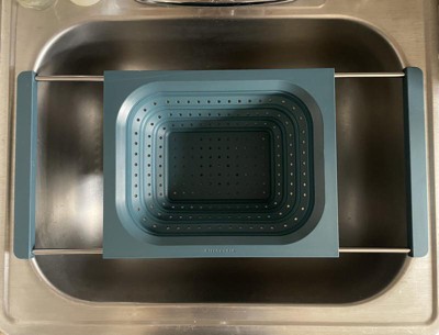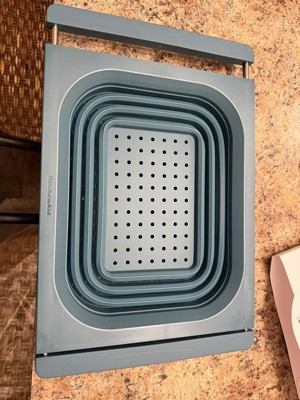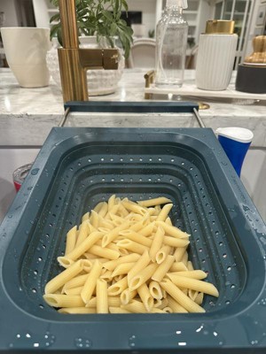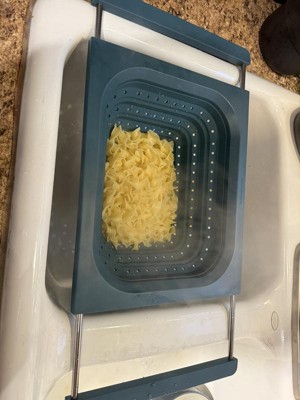 This strains well and fits nicely vertically over the sink. My sink is 21.5”, edge to edge, so even though it just barely fits horizontally, the silicone handles ensure it doesn’t slip. Being over-the-sink, it lets you use two hands to pour bowls, pots, and pans into the colander, but its square edges make it less functional for pouring food back into pans and bowls without spilling a little. It’s dishwasher safe, but because it doesn’t indicate the material the metal parts of the handles are made of, I’ve been hand-washing and air drying it with the handles extended to avoid rust inside the sleeves. I’ve used it four times, and it already has a few nicks and dings on the hard silicone/plastic part so I don't know how durable it is. I love over-the-sink kitchen tools & gadgets. This colander is convenient for straining, is easily collapsible, and while it doesn't get completely flat, it’s easy to stack in my cabinet. I don’t dislike it, but last night I made pasta and used my old one.
