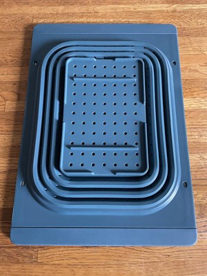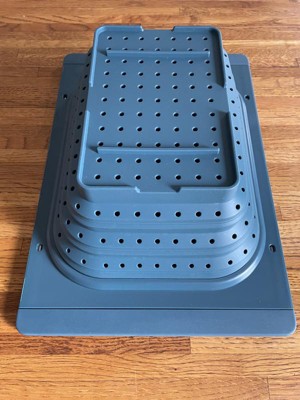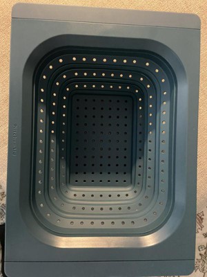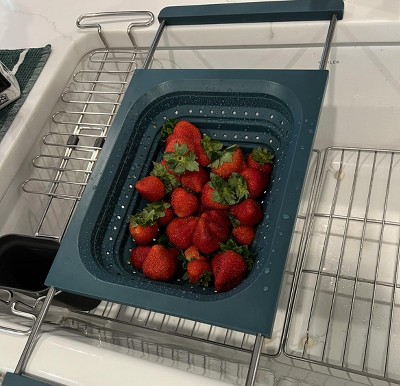 First, I love the color. Secondly, I really like how this fits into any size leveled sink. This is sturdy enough to accommodate any type of fruits or vegetables to clean and rinse. This is also great for pasta of any type.
