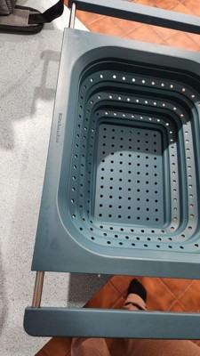 This collapsible colander is my new favorite kitchen gadget! With extendable arms it can hang over any sink size. It holds 4 quarts and is very well made. It collapses down to 1.7 inches for each storage. Everyone needs one of these for their kitchen!