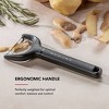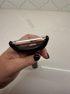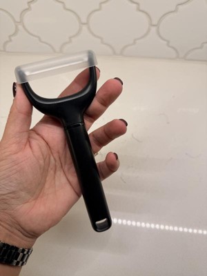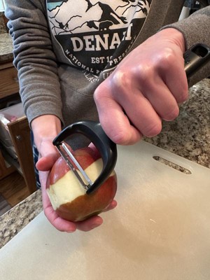 This peeler is sturdy and comes with a protective cover, but that is where the benefits end for us. Due to the straight handle and the gap from the end of the handle to the actual peeler, it makes it difficult to have your hand on the fruit/vegetable and peel at the same time, especially if you have smaller hands (see photos). It works if you're able to grip it properly, but the awkward angle made it so I would not be able to peel a lot at once.