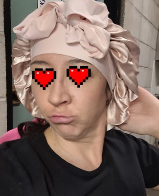 I have never used a satin bonnet before. However, seeing a d hearing women talk about how much they love theirs, made me want to try it. I love the cherry print! I am having a lot more shedding these days and am desperately trying to keep what I still have. I have worn the bonnet over my heatless curlers. Because they are both satin, I didn't have an easy time keeping the curlers in. However, I feel that the friction of my hair on my satin pillowcase is zero!
