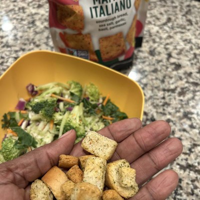 [This review was collected as part of a promotion.] My child and I truly love these delicious Italian croutons. They are the perfect size, perfectly crunchy, and as you can see our favorite for just a snack with some ranch and carrots or of course on salads. The croutons taste very fresh and are very flavorful in each bite. They also hold up decent so if you take a bite (as featured) it isn’t going to just turn to crumbs. These are really good croutons and definitely our new pick from the shelf! I received an incentive to write this review.