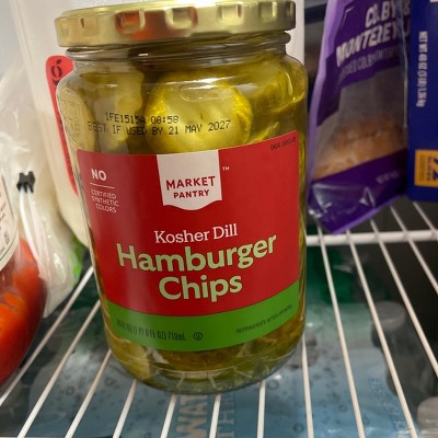 Add crunchy, tangy goodness to your burgers with these Kosher Hamburger Dill Chips from Market Pantry™. These kosher dill pickles are cut into small slices so you can easily add them to burgers and sandwiches. Each pickle contains zero calories per serving and they’re made with no certified synthetic colors so you know you’re enjoying pure flavor with every bite. Whether you’re enjoying them as a snack or with a meal, these dill pickle spears are a must-have for pickle lovers.