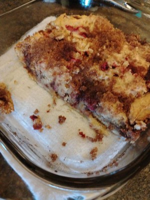 I'm rating a 2 today I usually would give a 5. However I made this coffee cake today and I'm not sure what happened I've made this 100's of times and had this happen twice the first time I thought it was my error but after today I don't think so I make the mix according to the box and add fresh cranberries usually turns out great not today didn't raise taste flouring