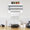 kitchen roll dispenser rack adopts upgraded ABS materials, non-toxic, durable and safe. A space saver for regular paper roll (Its width within 11.02inches) and serves as a plastic wrap and foil dispenser with ergonomic sharp sliding cutter. The top part gives you an ideal spice rack. Our dispenser racks can bear up to 11lbs. Easy installation via our included screws and adhesive tapes. Wall-mount design enable you to stick it anywhere you want, from the kitchen counter-top to your toilet and bathroom storage, etc.