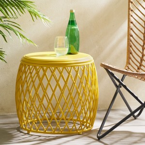 Kumasinova 17.7"Barrel-Shaped Outdoor Side Table with Lattice Woven Frame,Powder-Coated Iron Patio End Table with 20lbs Capacity for Poolside,Yellow