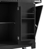 This versatile 48.5-inch kitchen island cart features a innovative tilt-out trash bin cabinet that discreetly conceals a 10-gallon bin while keeping your kitchen organized and odor-free. The unit includes three smooth-gliding drawers and three open side shelves, providing versatile kitchen storage for spices, bottles, and dining essentials.