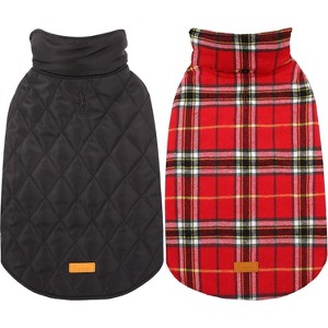 7-size reversible dog winter coat: waterproof polyester, double fleece lining, neck/belly magic stickers, back leash hole, 17 British plaid colors. Fits most breeds; size up if unsure.