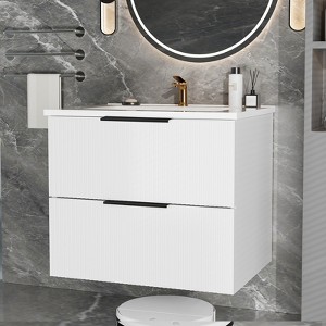 - Wall-mounted Design: This modern bathroom vanity features a wall-mounted design, effectively preventing moisture buildup at the bottom and reducing hard-to-reach areas, simplifying your daily cleaning routine.