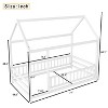 This floor bed with a unique wood house roof frame brings natural charm and imaginative fun to bedtime. Designed with high, sturdy fences, it boosts stability, reduces safety risks, and accommodates thicker mattresses for extra comfort. Crafted from premium pine wood, its solid house frame ensures long-lasting durability. The guardrails feature a convenient opening for easy access, while the enclosed design creates a cozy private nook perfect for reading and play.