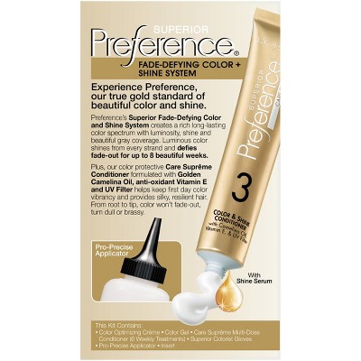 L'Oreal Superior Preference Hair Color – our gold standard in luxurious permanent hair color since 1973. Superior Preference at-home hair coloring kit is special because it delivers super shiny luminous hair color. Preference gives you long lasting hair color that’s fade-defying for weeks and weeks. From root to tip whether you have blonde hair, brown hair, black hair or red hair color, your color won’t look dull or brassy. We pair our translucent gel hair dye formula with our exclusive Care Supreme Conditioner with Shine Serum that help keep color vibrancy and provides silky and shiny hair. Preference is available in over 50 Luminous Shades. Our Luminous Blonde shades range across a wide spectrum from light blonde to dirty blonde, honey blonde to red blonde and strawberry blonde to champagne blonde. Our rich Brown shades range across the spectrum of ash brown to sun-kissed caramel brown. Our deep Red shades range from dark red to auburn and copper to mahogany to burgundy. Each shade is crafted to show infinite tones and reflects, so you can find your own Superior Preference signature.