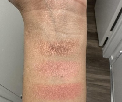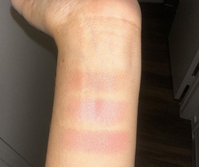 From top on my wrist to bottom: Subtle sable Rosy outlook Apricot kiss Photos included show the blush colors in different lighting Loved the color Apricot! Such a pretty color on my light medium olive skin tone. Rosy outlook was a light bubble gum pinky shade that I could ware but kinda did not really look that best on me. Subtle sable looked like a could be a good bronzer shade on me but really orange on my olive skin tone. Did not enjoy that shade as much as I thought I would. Overall, these blushes are NOT super pigmented, BUT you definitely can build them up so that they can be a bit more punchy. My reason for returning them and for only giving them three stars is that they didn’t last all day and didn’t wear well throughout my workday and I don’t do anything crazy. I have an office job. So I returned them because I want something that looks good all day and stays on all day.