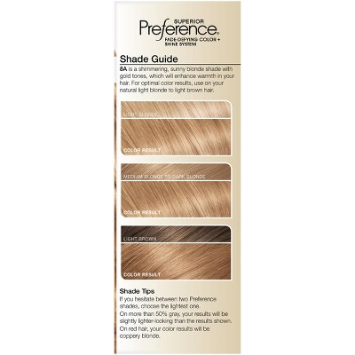 L'Oreal Superior Preference Hair Color – our gold standard in luxurious permanent hair color since 1973. Superior Preference at-home hair coloring kit is special because it delivers super shiny luminous hair color. Preference gives you long lasting hair color that’s fade-defying for weeks and weeks. From root to tip whether you have blonde hair, brown hair, black hair or red hair color, your color won’t look dull or brassy. We pair our translucent gel hair dye formula with our exclusive Care Supreme Conditioner with Shine Serum that help keep color vibrancy and provides silky and shiny hair. Preference is available in over 50 Luminous Shades. Our Luminous Blonde shades range across a wide spectrum from light blonde to dirty blonde, honey blonde to red blonde and strawberry blonde to champagne blonde. Our rich Brown shades range across the spectrum of ash brown to sun-kissed caramel brown. Our deep Red shades range from dark red to auburn and copper to mahogany to burgundy. Each shade is crafted to show infinite tones and reflects, so you can find your own Superior Preference signature.