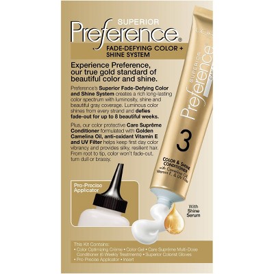 L'Oreal Superior Preference Hair Color - our gold standard in luxurious permanent hair color since 1973. Superior Preference at-home hair coloring kit is special because it delivers super shiny luminous hair color. Preference gives you long lasting hair color that's fade-defying for weeks and weeks. From root to tip whether you have blonde hair, brown hair, black hair or red hair color, your color won't look dull or brassy. We pair our translucent gel hair dye formula with our exclusive Care Supreme Conditioner with Shine Serum that help keep color vibrancy and provides silky and shiny hair. Preference is available in over 50 Luminous Shades. Our Luminous Blonde shades range across a wide spectrum from light blonde to dirty blonde, honey blonde to red blonde and strawberry blonde to champagne blonde. Our rich Brown shades range across the spectrum of ash brown to sun-kissed caramel brown. Our deep Red shades range from dark red to auburn and copper to mahogany to burgundy. Each shade is crafted to show infinite tones and reflects, so you can find your own Superior Preference signature.