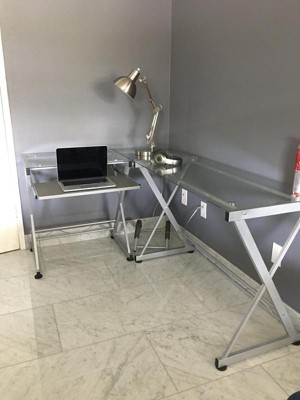 L-Shaped Computer Desk Silver/Clear - Techni Mobili: Reversible, Heavy-Duty Tempered Safety Glass, Steel Frame, MDF Keyboard Shelf