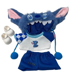 Labubu is having an extra playful day, dressed up as everyone’s favorite blue troublemaker—Stitch! His cozy headpiece is made from soft blue plush fabric and features oversized expressive eyes, long notched ears, and a row of sharp-looking felt teeth that create the perfect mischievous look without being too scary. His white knit shirt adds even more charm with mismatched sleeves: one in a blue square print and the other in solid blue accented with pink trim. Front and center on the bodice is a picture of the one and only real Stitch, making his inspiration unmistakable. Labubu’s bright blue pants proudly display the word “Stitch,” just in case anyone needs a hint about who he’s channeling today. The outfit is completed with matching white shoes, making this fun and energetic costume perfect for imaginative adventures, themed photos, or simply a day filled with playful antics. This listing is for one doll outfit, the doll is not included.