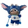 • Labubu’s bright blue pants proudly display the word “Stitch,” just in case anyone needs a hint about who he’s channeling today and the outfit is completed with matching white shoes.