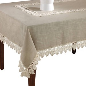Set your table and the mood with this Lace Trimmed Tablecloth. This formal tablecloth with lace trim has decorative edges and a decorative centerpiece.