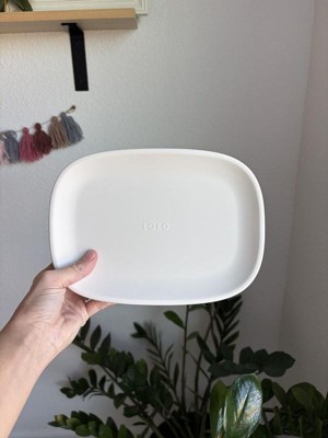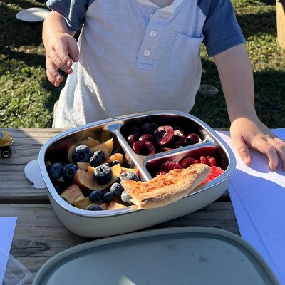 Great for mealtimes on the go or at home to keep items separate. A large size that will fit a full meal beyond the toddler years and all sturdy materials that look like they will hold up well.