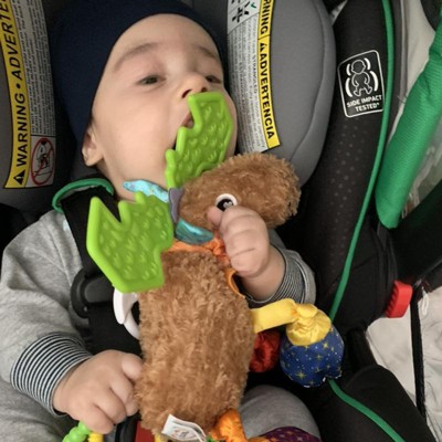 I love this moose for my son I recommend you air dry this toy so the eyes won't melt I hit him in yellow. This moose would remind me of driving truck in New Hampshire Pregnant with my sons father. Now baby number two and I'm considering this a great toy to stimulate their minds and great for teeth option you can put it in stroller, car seat, bassinet, and crib