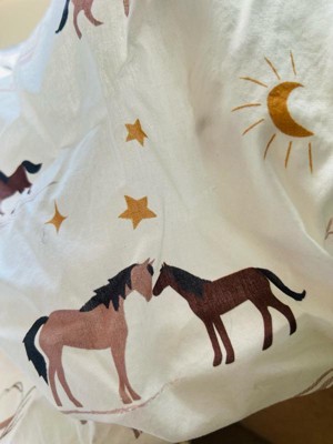 Your little cowboy or cowgirl will love drifting off to dreamland surrounded by the softest textures and calming colors of the prairie. This breathable 100% cotton fitted crib/toddler sheet features playful horses, cowboy hats and boots, wagon wheels, cacti, sun, moon and clouds. There is elastic all the way around ensuring a safe and secure fit on a standard size crib mattress measuring approximately 28 inches by 52 inches.