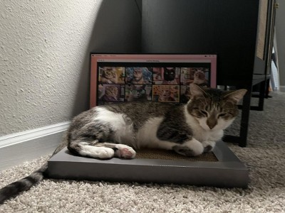 I don't know about you but I was also sad when the little cat couch shaped cat scratchers were no longer available at Target. This thing has more than fixed that problem, it is adorable! My cat thinks that she is on some zoom meeting and regularly moves her mouse around like the corporate overlords are tracking her activity on her computer and she just wants to nap from home. All jokes aside, my cat really does love scratching this, rolling on it, sleeping on it, standing on it, just being on it. Oh, and she loves the mouse shaped mouse. She loves smacking it around.