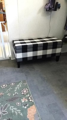 Bring a combination of classic style and versatile storage to your space with this Plaid Decorative Storage Bench from HomePop. Featuring an iconic black and white plaid exterior for timeless style, this upholstered storage bench brings a welcoming accent to your space whether you use it in your living room or your entryway. The rectangle frame offers plenty of space for sitting and relaxing, while the hinged top makes it easy to store shoes, pillows, board games and more. Painted hardwood legs complete the look while providing stability, making this bench a functional and stylish addition to your home. Please note that fabric and wood colors may appear slightly different due to variations in lighting or screen settings.