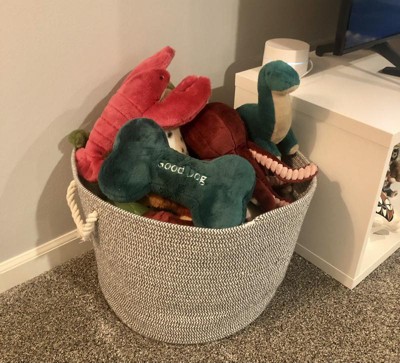 Great for toy storage. This is a very roomy basket. It’s slightly floppy but stands up on its own. Probably not supposed to machine wash it, but I did and it came out fine (gentle, no dryer).