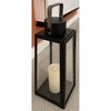 Hype up your alfresco area with the Hugh Decorative Lantern and its sleek, transitional style. The trapezoidal design features bold over scaled clear glass panes paired with a bold metal frame to inject a modern edge. With this decorative lantern, you can take the light where you need it whether that’s on a porch, a screened in patio, or next to an inside fireplace. With an LED faux flame wick candle included, it’s easy to make Hugh pop inside or out – with no electrical wiring required.