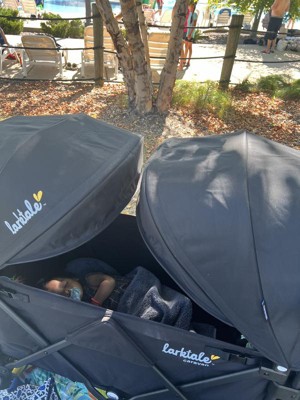 I provided this honest and true product review in exchange for a rebate on my purchase. Please believe me when I say I’ve been researching wagons for YEARS and had analysis paralysis, overwhelmed with choices and second guessing my first choice (which was always the Larktale Caravan). I’m so happy I waited for the 2023 Caravan V3! We use it as our double stroller for our 5 year old and 1 year old. There are some great perks to it but there is a major flaw. pros: - all black with leatherette brown handle is very chic! - basket can be moved to the front or back - very roomy - two kids can fit side by side if needed - seats recline without losing any space in the footwell - great warranty (though I haven’t needed to use it) - stretchy pockets next to each seat (4 total, 2 on each side) that can comfortably fit a child’s water bottle - comes with parent console - wheels are durable and smooth - has a pull bar cons: - the footwell cover unzips completely (this is new with the 2023 V3). While nice it can be removed, it is SO DIFFICULT to get the cover in place to zip and close. Not just that, sometimes the zipper gets stuck and does that thing where it unzips from both sides… the zipper is not good. I have no idea why they made this change, but I’m disappointed and would definitely prefer the previous versions where it folds into the footwell or back onto the seat. My work around is to not zip both sides because the cover will rest on the bar of the footwell. This isn’t perfect, and no one can sit on the footwell when it’s like this, but for my baby to nap it’s fine. - The canopies obstruct your view of your baby or child inside. I knew this going in - it was one of the things holding me back from buying the caravan. I much prefer the canopies on the coupe where they lay flat when not in use. I find the way the canopies stick straight up when not in use to be very unattractive. They do make a wonderfold style sun topper for the caravan v3, but at the time I’m writing this review, it’s not out yet. My personal favorite canopy is that of the Keenz or Jeep (boxy with drop down shades that tuck into the canopy when not in use). Hopefully they will make something like that in the future. Overall, it’s a great wagon, and fits nicely in my 2005 Toyota Highlander trunk with extra room for groceries or other items! You can tell the wagon is made with high quality materials, no flimsy or cheap feeling materials.