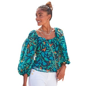 Get ready for a fun time in this vibrant blouse. * Puff sleeves * Sweetheart neckline * Print may vary * 100% Polyester. Imported. * Machine washable