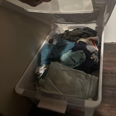 This is a great large tote which could be used for so many things - crafts, books, clothes, blankets, etc. we have several of these and use them for various purposes - shown here is the one we use for off season clothes - in our area we need seasonal clothes especially for vacations in the off season and these totes are so nice to dump the clothes in when we aren’t using them or for hand-me-downs. They have super nice latches on them to really keep the lids on and are so nice. They hold so much!