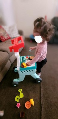 super cute fun age appropriate toy for my 2-year-old very safe has multiple ways to use it makes noise rolls around like a shopping cart they can play food and shapes very good value