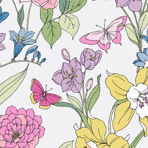 A full roll of this product is 20.5 inches wide and 396 inches long. A full roll can cover up to 56 square feet depending on the design match and pattern repeat. A sample of this product is 8 inches by 11 inches. Inspired by a piece of painted artwork, this charming line drawn floral design features an abundance of stylised blooms. Dahlias, daffodils and delphiniums form a continuous and colorful pattern. Delicate butterflies perch on curling stems to make this striking print perfect for many areas of your home. Offers a smooth, untextured finish. Offset match with a 40.95 inch pattern repeat.