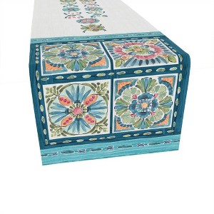 This boho themed runner, "Boho Plaza" runner will give any home a fun pop of color. "Boho Plaza" features vibrant pink, green, and blue tile patterns on the top and border of the design. Add this bold, soft to the touch runner will illuminate any dining space for any occasion.