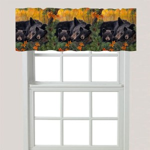 This seasonal lodge window valance, "Warm Cozy Bears," features a bear and it's cubs sleeping on a Fall day. This serene design features cuddling bears surrounded by leaves, green grass and a beautiful orange sunrise. Add a touch of calm Autumn feelings to your room with "Warm Cozy Bears" for the seasonal spirit!