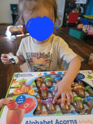 [This review was collected as part of a promotion.] I really love that this can be used in a variety of ways and seemingly for a range of ages as well. My daughter is 3.5 and was able to realize this in certain areas, matching, colors, etc. I feel like once she learns letters a bit better she will be able to also figure out which characters go to what letter and this will make it even more useful for years to come. I love that the acorns are firm and the lids are pliable to where you can squeeze or manipulate them a bit to get onto the acorns.