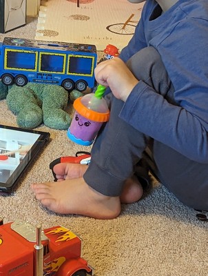 [This review was collected as part of a promotion.] My grandson liked it for the first couple of days but he bores with it quickly. He picks it up now ans then but not often. The cup wouldnbe much better if twisting it made thw syraw go up and down instead of it just pulling out and dropping down. It is cute though!