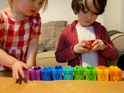 An excellent toy for young ones who are curious and love opening presents (Who doesn't enjoy, opening presents!) The toy contains 10 bright coloured present boxes, that when opened reveal little treasures (small toys). Firstly the colours of the boxes, are thought-provoking and suitable for both boys and girls. The numbers allow them to develop their counting skills and gain confidence with number recognition. Our two (3-year-old girl, and 6-year-old boy) have loved this toy for WEEKS it has been used with such enjoyment. They use it to play number games, or to pre-tend play 'Christmas' & 'Birthday' with their other toys. The boxes open and close easily for little hands, and the small toys are very thoughtful and relevant. With small groves to allow the boxes and lids to match up, this took a couple of attempts for our three-year-old to master, but she did so easily. A toy that takes pride of place in our toy collection, thank you Learning Resources.