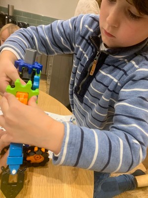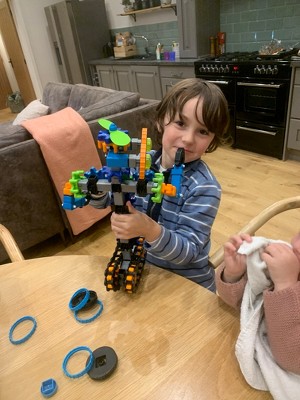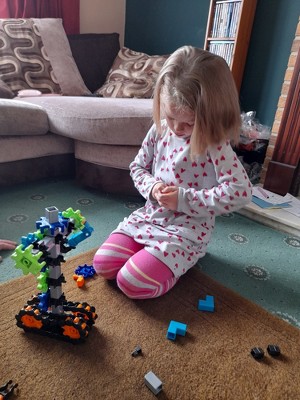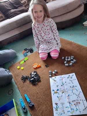 Dotty really enjoyed creating robots from her imagination. She also loved being able to follow instructions like daddy does when building and putting all her pieces in piles for following the instructions step by step. Some pieces where hard to connect at the beginning but after a few creations they became easier to connect. The product comes in a handy storage box. All parts are nicely coloured to create out of this world robots and creatures.